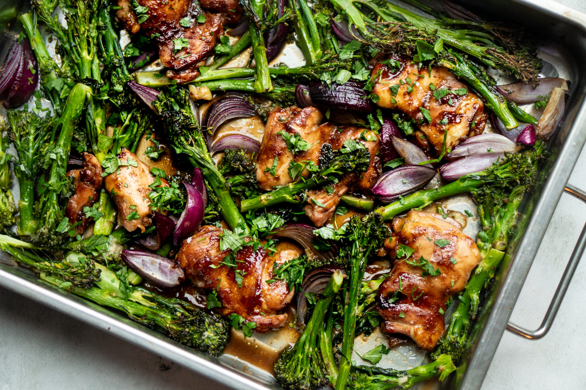 Snelle traybake van kippendij met bimi, rode ui en hoisinsaus