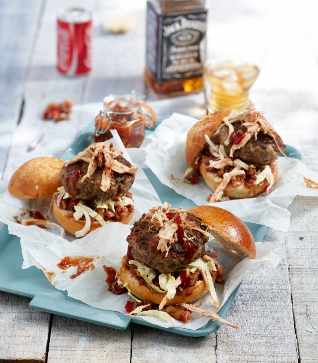 Smeer een eetlepel bacon-jam op de bodem van elk broodje. Leg daarop de koolsalade, dan de burger, de pulled pork, de bbq-saus en top het af met de bovenste helft van het broodje.