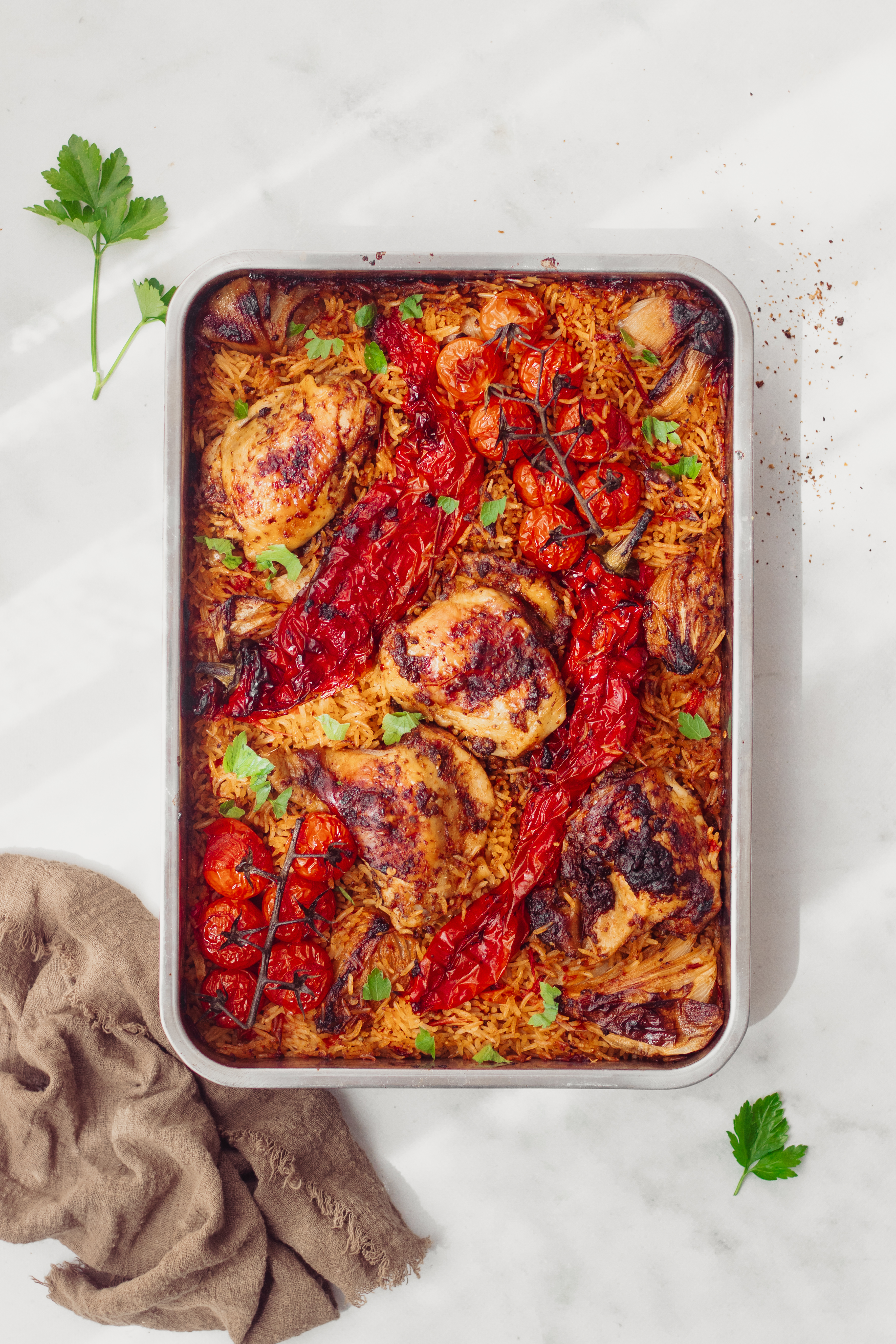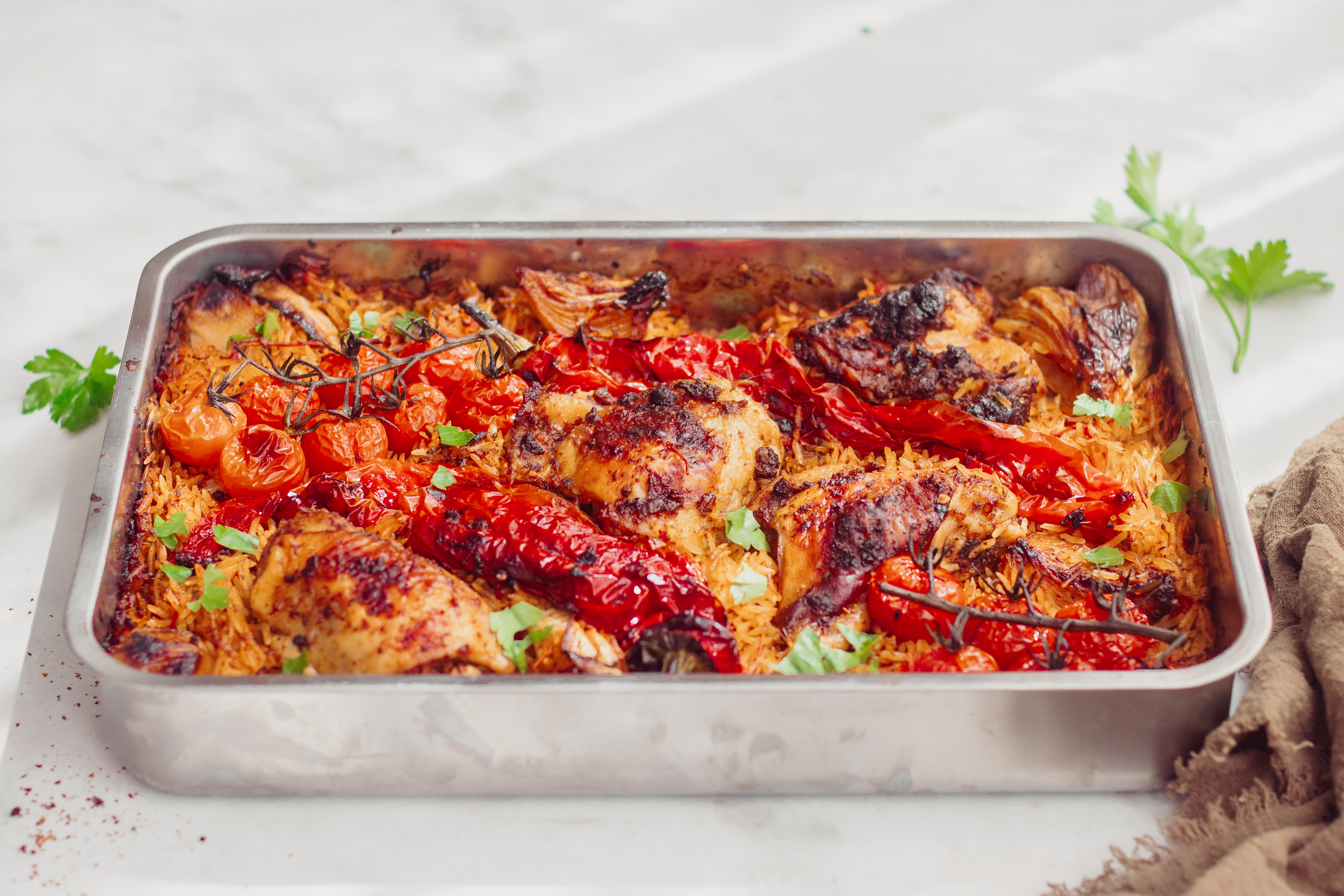 Tavuk Kapama is een Turkse traybake met rijst, kip en een heleboel puntpaprika’s. Zo simpel, dat we ons afvragen waarom we het ovengerecht nog niet eerder hebben gemaakt.