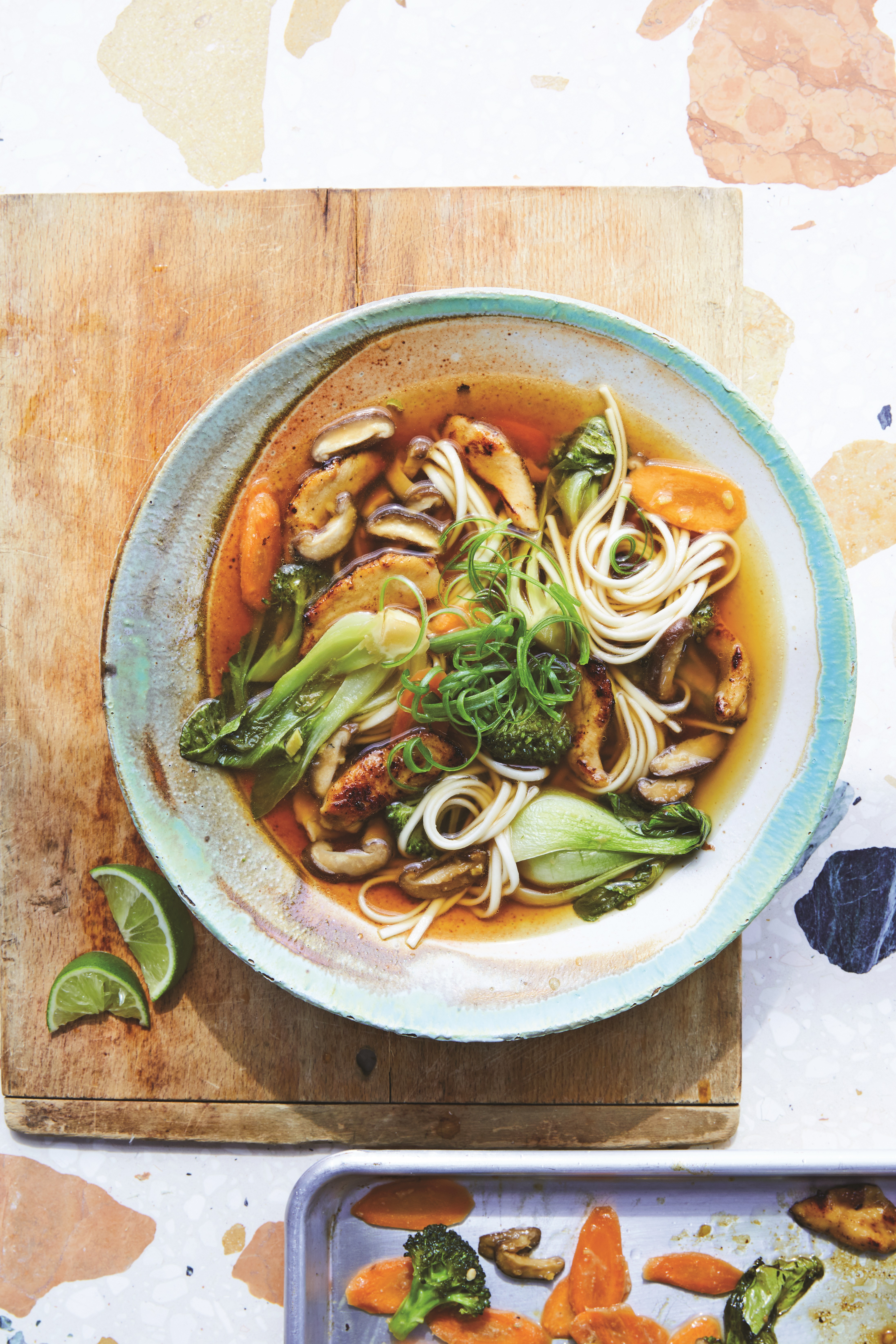 De familie Pollan: “Traditionele udonnoedelsoep wordt gemaakt met een bouillon van varkensvlees, maar wij wilden hem graag met een rijke kippenbouillon maken. We hebben meer groenten toegevoegd om er een kleurrijke, voedzame avondmaaltijd van te maken. Door de groenten en de kip eerst met miso te bestrijken, krijgen ze een diepe umami smaak.”
