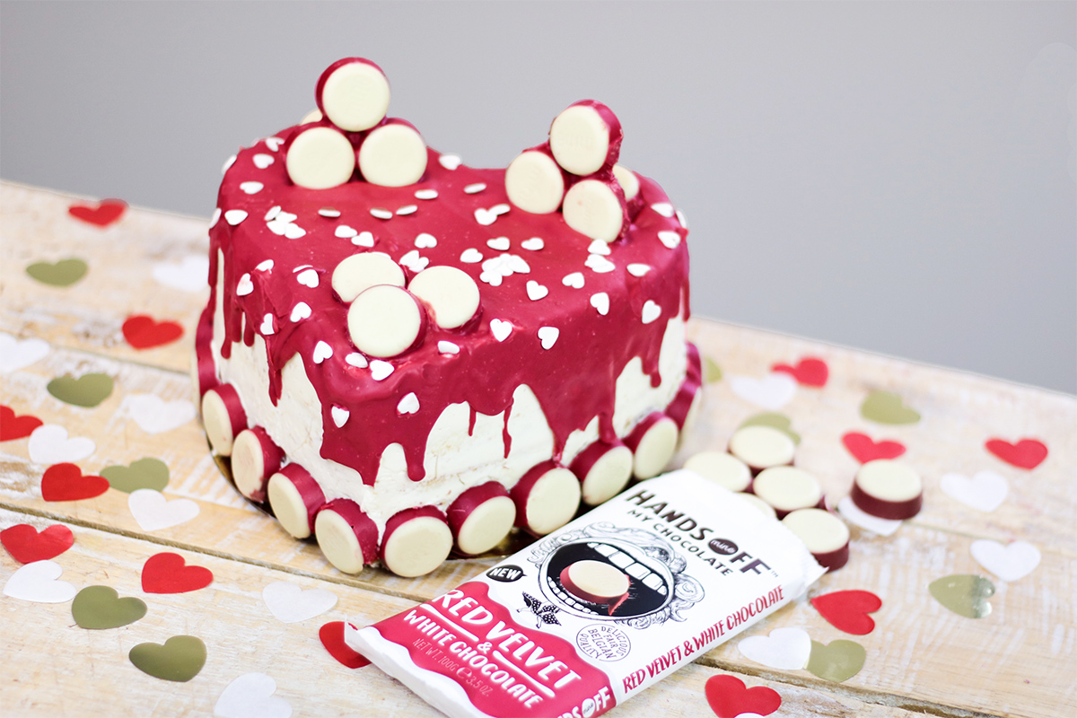 Als je denkt aan de ultieme valentijns taart, denk je natuurlijk aan red velvet! Want deze taart heeft de kleur van de liefde. En laat Hands Off My Chocolate nou net een lekkere red velvet chocoladereep hebben, waarmee je zo’n heerlijke taart kunt bakken.