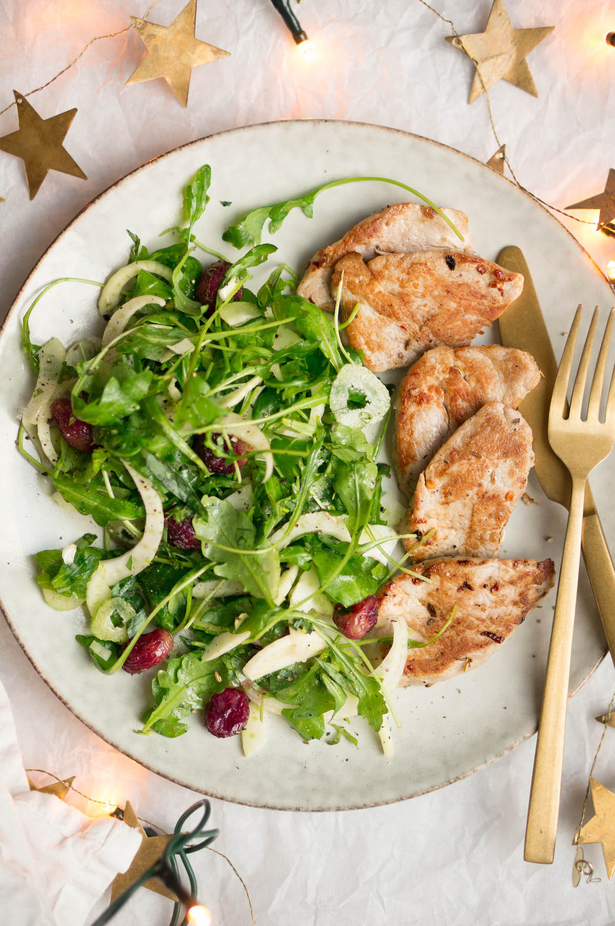 Varkenshaas met venkelsalade en geroosterde druiven
