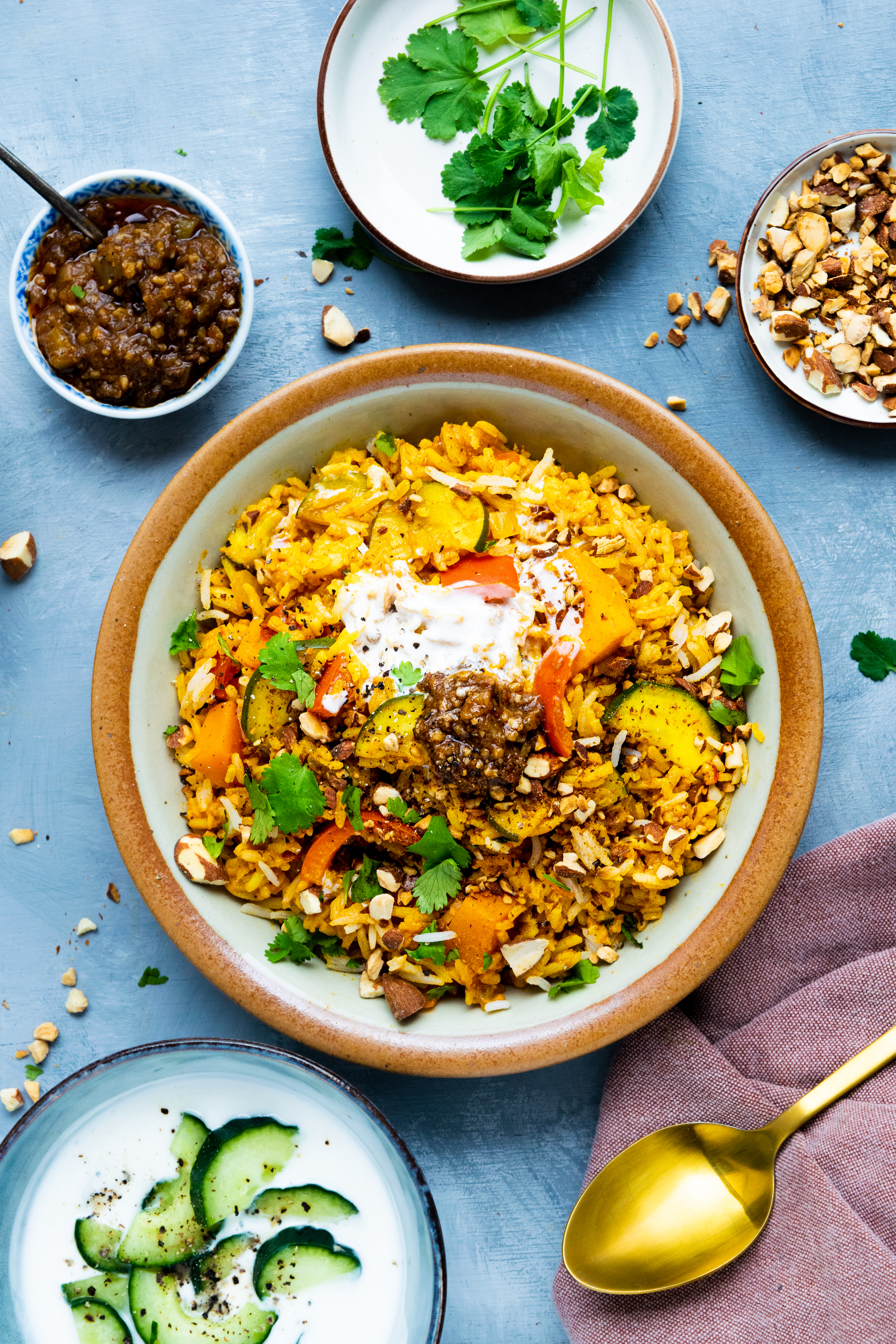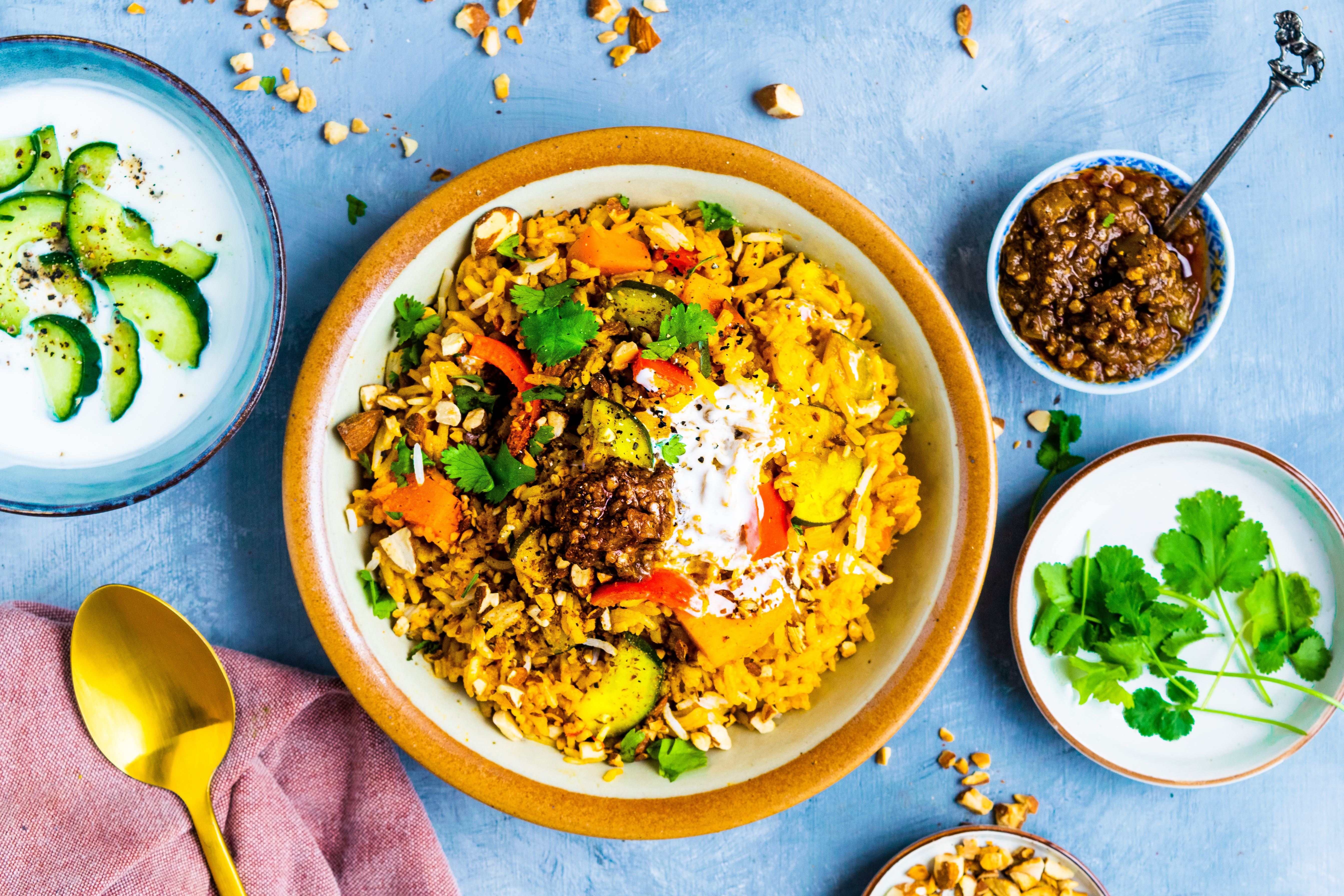 Een explosie van geuren, kleuren en smaken dus, die niet volledig is zonder een rits toffe bijgerechten. Deze vega biryani kun je bijvoorbeeld serveren met een pittige mangochutney en een eenvoudig bijgerecht van komkommer, yoghurt en zwarte peper.