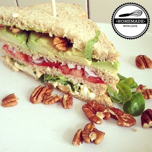 Beleg de eerste boterham met de eiersalade en de veldsla. Leg daarop de tweede boterham en beleg deze met de plakjes tomaat en uienringen. Leg daarop weer een boterham en beleg deze met avocado en pecannoten. Dek af met de laatste boterham.