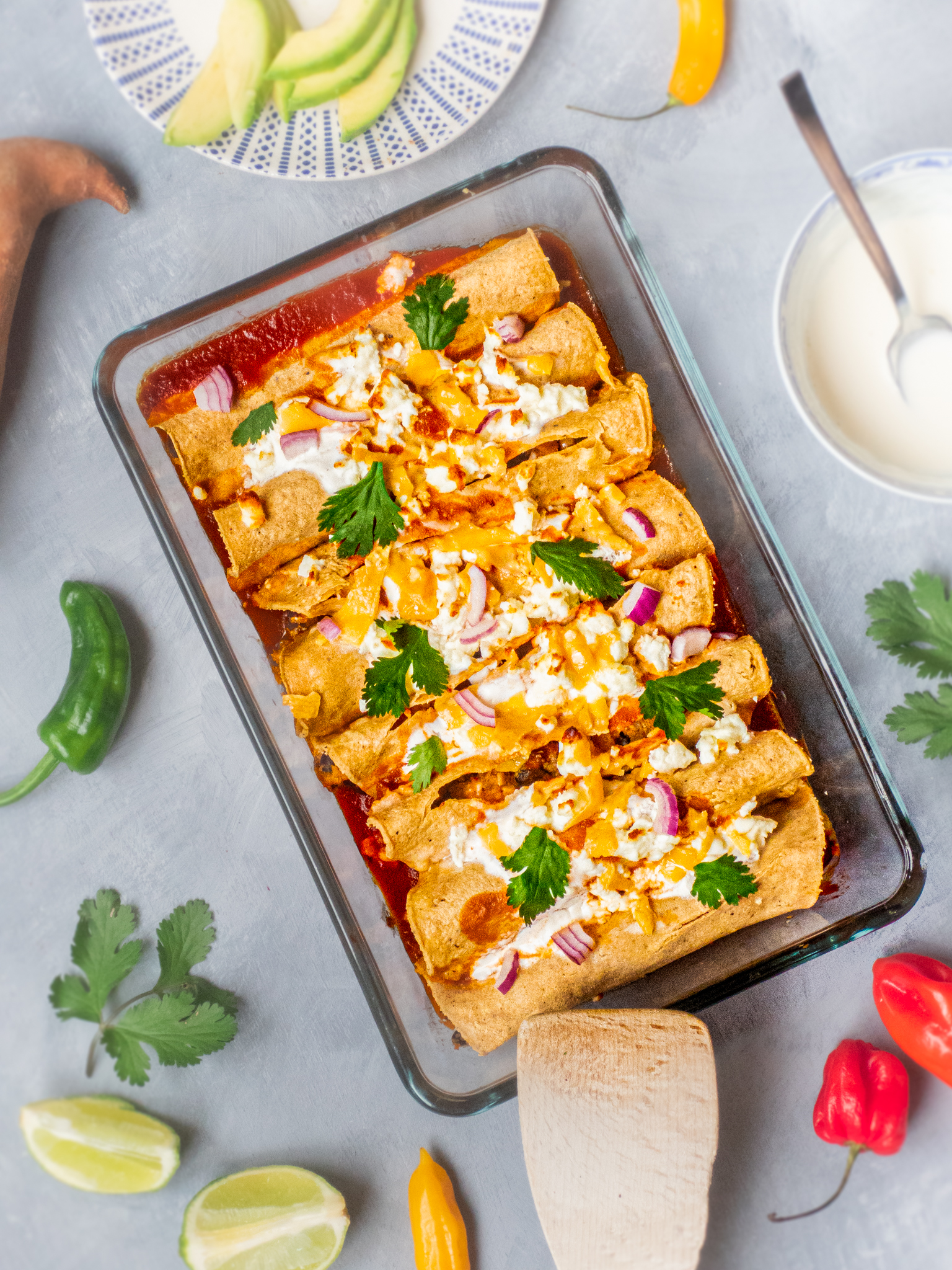 Enchiladas zijn het perfecte voorbeeld van Mexicaans comfort food. Wij maakten een vega versie met zoete aardappel, zwarte bonen en natuurlijk flink wat kaas die heerlijk gaat smelten in de oven.