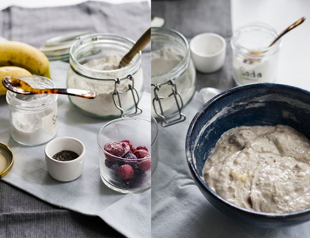 Meng in een kom de banaan, chiazaadjes, olie en melk tot een homogeen geheel. Voeg daarna de bloem en bakpoeder toe. Het beslag mag een beetje aan de dikke kant zijn, maar niet té dik; ongeveer even dik als cakebeslag. Als je denkt dat het beslag toch te dik is, voeg er dan nog wat melk aan toe. En als het te dun is, voeg je een een halve tot een hele lepel bloem toe.