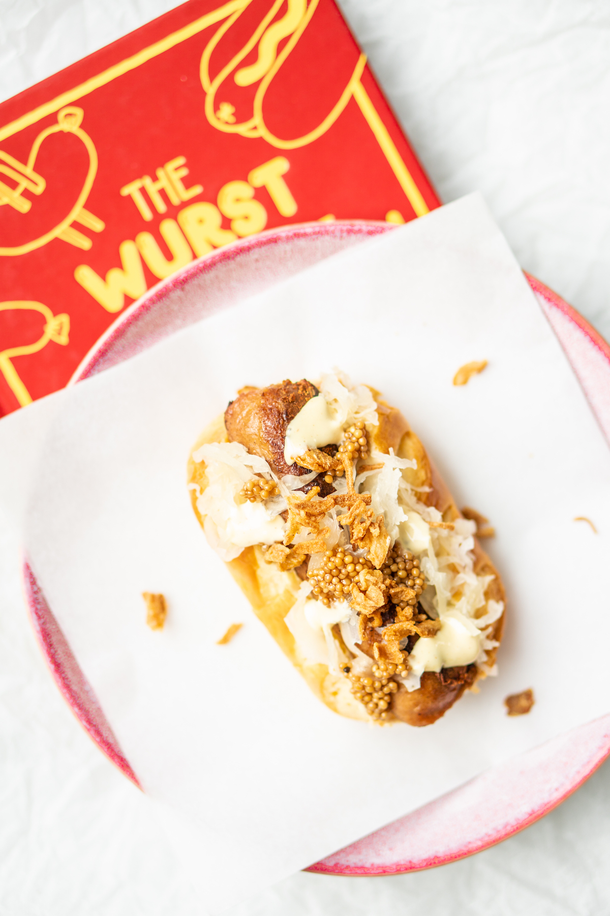 Besmeer de hotdogbroodjes met een beetje van de mosterdmayonaise en leg de worsten erin. Verdeel er wat van de zuurkool, wat plakjes augurk en wat van het ingelegde mosterdzaad overheen. Bestrooi tot slot met de gefruite uitjes.