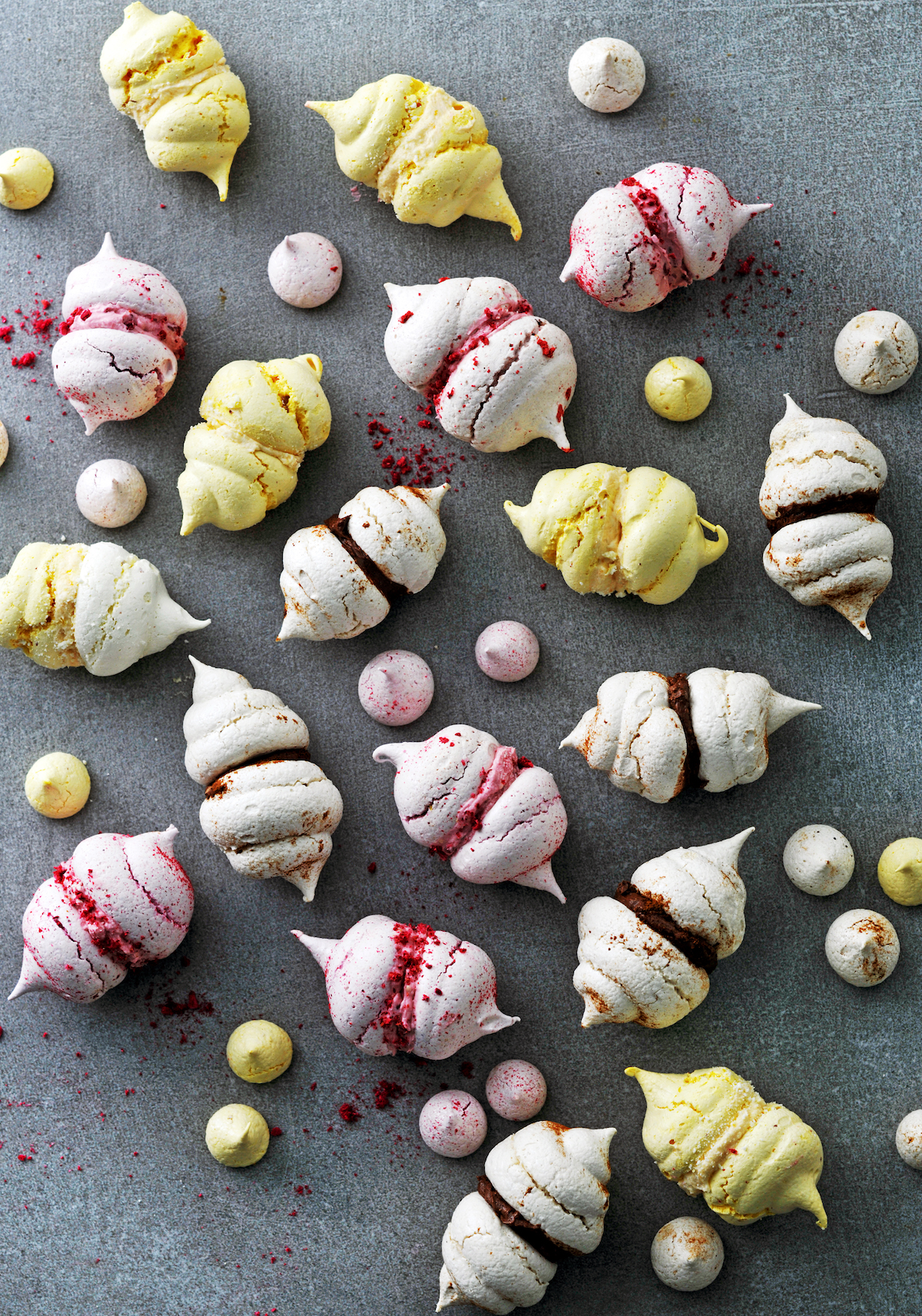 Dosia: “Deze luchtige torentjes kun je maken met allerlei smaken en kleuren. Ik geef hier recepten voor vanille-, saffraan-, espresso- en frambozen- of aardbeienmeringues. Ik maakte kleine schuimpjes, maar je kunt natuurlijk ook grotere, meer indrukwekkende meringues bakken. Dan hebben ze wel wat langer nodig in de oven. Ik plakte de meringues aan elkaar met een crème, maar dat hoeft natuurlijk niet. Ze zijn zo ook lekker!”