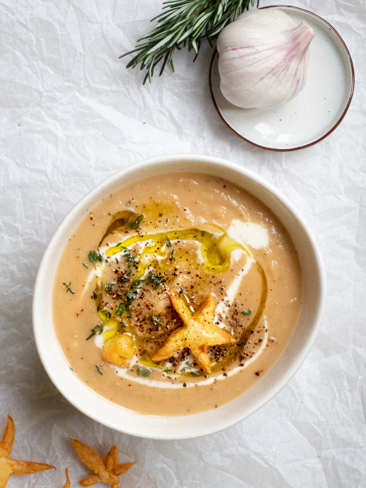 Dit gegeven zijnde, bedachten we een feestelijk ingestoken soepje: een vegan pastinaaksoep met plantaardige room en bladerdeegsterretjes. Ideaal voor kerst, toch?