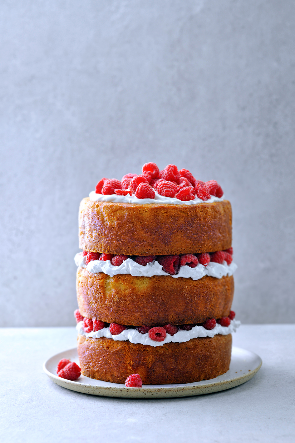 Verdeel de helft van de uitgelekte yoghurt en de helft van de frambozen over de bodem en dek af met de bovenkant van de cake. Versier met de rest van de yoghurt en de frambozen.