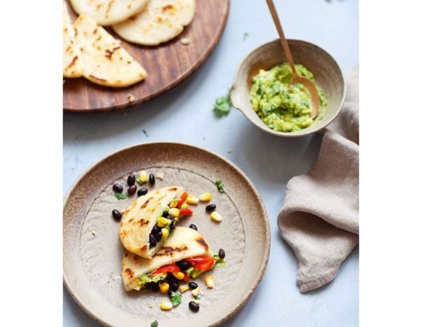 Vegetarische arepa met zwarte bonen, mais, avocadosalsa & paprika