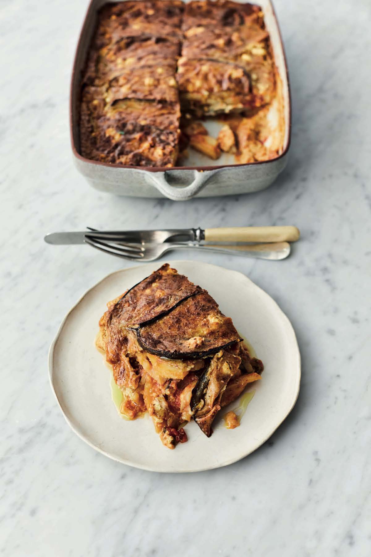 Zoete tomaat, gegrilde aubergine, romige saus met feta en eekhoorntjesbrood: de vegetarische moussaka van Jamie is om je vingers bij af te likken.