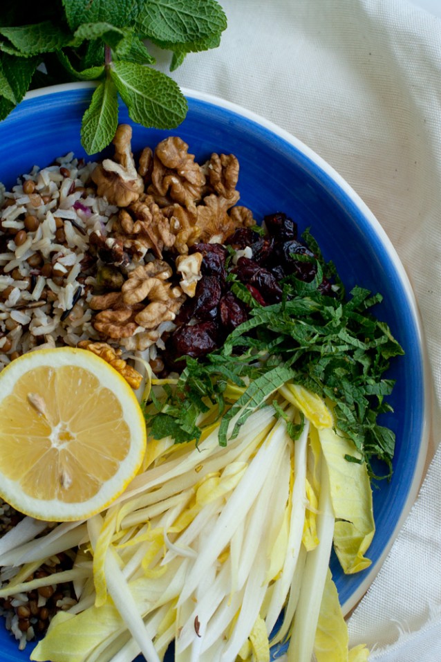 Voeg in een grote saladekom de rijst, linzen, gesnipperde sjalot, verse munt, cranberry’s en walnoten bij elkaar. Doe er een snufje zout bij en besprenkel het met wat citroensap. Hussel het goed door elkaar (mag ook met je handen).