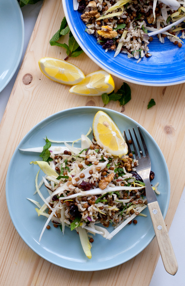 Deze frisse vegetarische rijstsalade met linzen en witlof is een perfecte lunch of makkelijk bijgerecht bij een wat zwaarder hoofdgerecht met vlees of vis. Een heerlijk recept van Wai seu Chan van de fijne blog With a pinch.