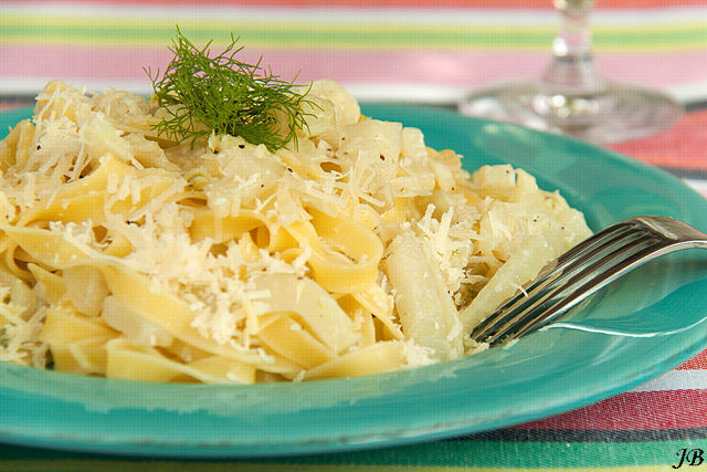 Kook intussen de tagliatelle gaar volgens de gebruiksaanwijzing. Giet de pasta af en doe bij de venkel in de pan en roer goed door. Leg de venkelpasta op een bord en bestrooi royaal met Parmezaanse kaas. Schenk voor jezelf nog een glaasje wijn in en smullen maar!
