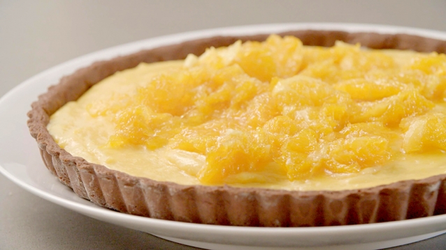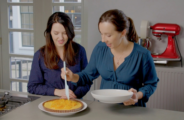 Samen met Monique maakte Sarena een heel klassieke Italiaanse taart: crostata. De basis voor deze taart is een zanddeeg, maar de vulling en toppings variëren. Sarena maakte haar variant met sinaasappelcrème als vulling en gekarameliseerde sinaasappel bovenop.