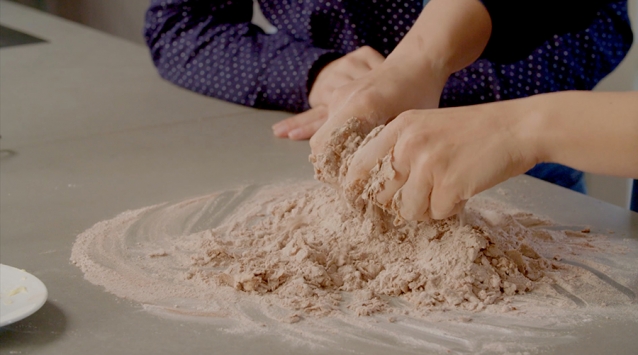 Zeef de bloem met het cacaopoeder op een schoon werkblad en meng de boter erdoor. Doe dit door er met twee messen doorheen te snijden, of door de bloem met de boter tussen je vingers te wrijven. Het is belangrijk dat de boter niet te veel opwarmt, meng daarom zo kort mogelijk.