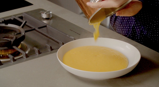 Verwarm alles al roerend op laag vuur tot de vulling de consistentie heeft van dikke vla. Laat deze niet koken want dan stolt het ei. Laat afkoelen in een bord in de koelkast met een velletje plastic folie erover.