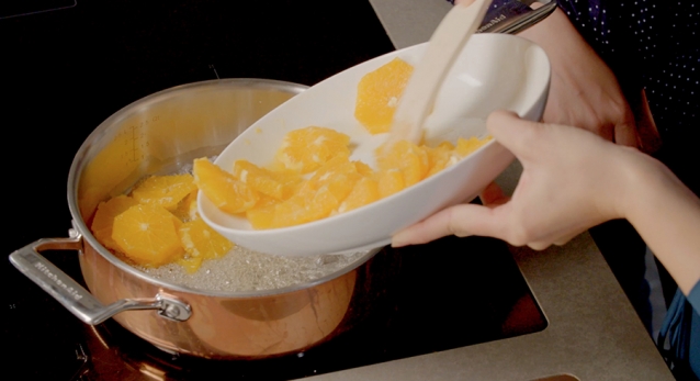 Suiker met scheutje water in pan. Licht laten karamelliseren. Sinaasappelen schillen en in plakjes snijden. In karamel even laten pruttelen. Uit pan halen in kom af laten koelen.