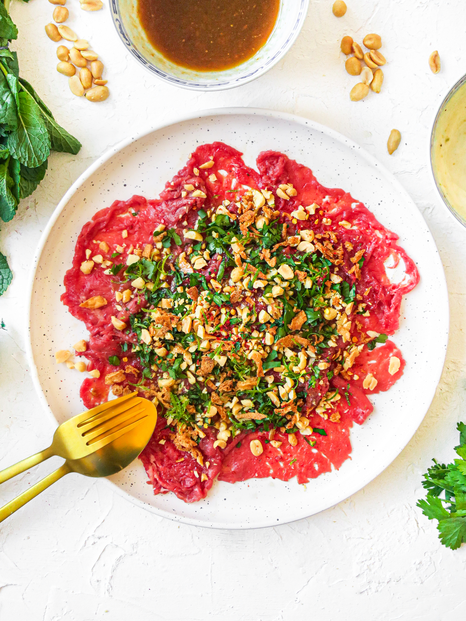 Carpaccio van rundvlees voorzien van verse kruiden en Vietnamese smaakmakers: we wilden dat we dit sublieme idee zelf hadden bedacht, maar nee hoor. Het was het Antwerpse restaurant BÚN dat ons op het idee bracht. We besloten om een eigen versie te maken en willen onze carpaccio voortaan alleen nog maar op deze manier.