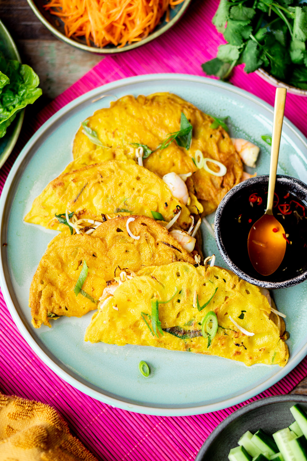 - Zet de ingelegde wortel, komkommer, verse kruiden, sla en nuoc cham klaar in kommetjes. Scheur of snijd de Vietnamese pannenkoek in stukken.