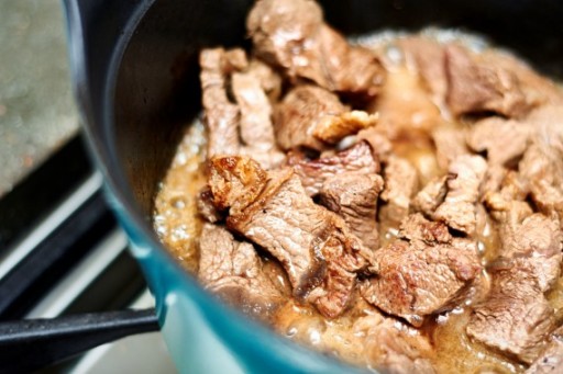 Bak hierin het vlees en breng op smaak met flink wat peper en zout. Zorg ervoor dat het vlees een mooi kleurtje krijgt en dat het goed dichtgeschroeid wordt. Zet ondertussen ook de runderbouillon op het vuur.