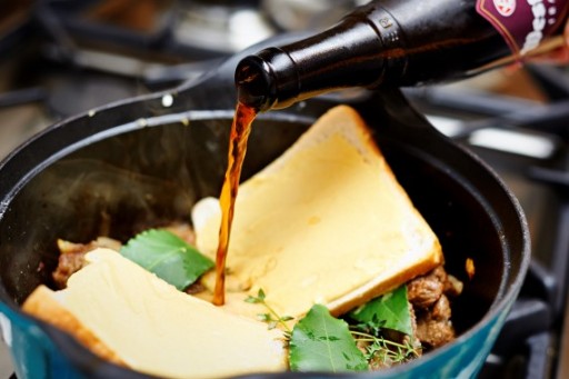 Voeg de laurierblaadjes en takjes tijm toe. Leg de boterhammen op het vlees en schenk het bier erbij. De laatste slokken kun je zelf opdrinken. Dat adviseer ik zelfs. Heerlijk! Voeg ook de runderbouillon toe.