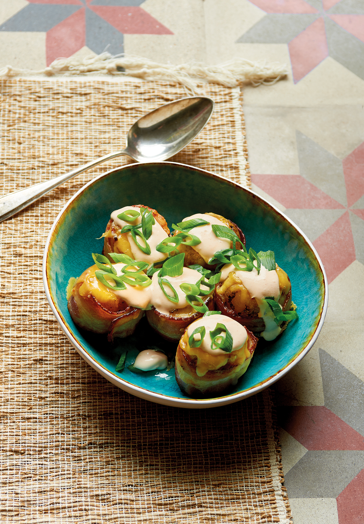 Vulcano Potatoes zijn gepofte aardappels die worden gevuld met ham en geraspte kaas en omwikkeld met bacon. Daarna gaat er nog zure room met sriracha en bosui overheen. If loving this is wrong, we don’t wanna be right.