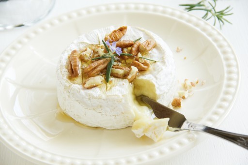 Duw de camembert aan de bovenkant een beetje in zodat de noten er goed bovenop blijven liggen. Giet het honingmengsel hieroverheen en leg het takje rozemarijn erop. Bak de camembert zo’n 8 minuten in de oven.