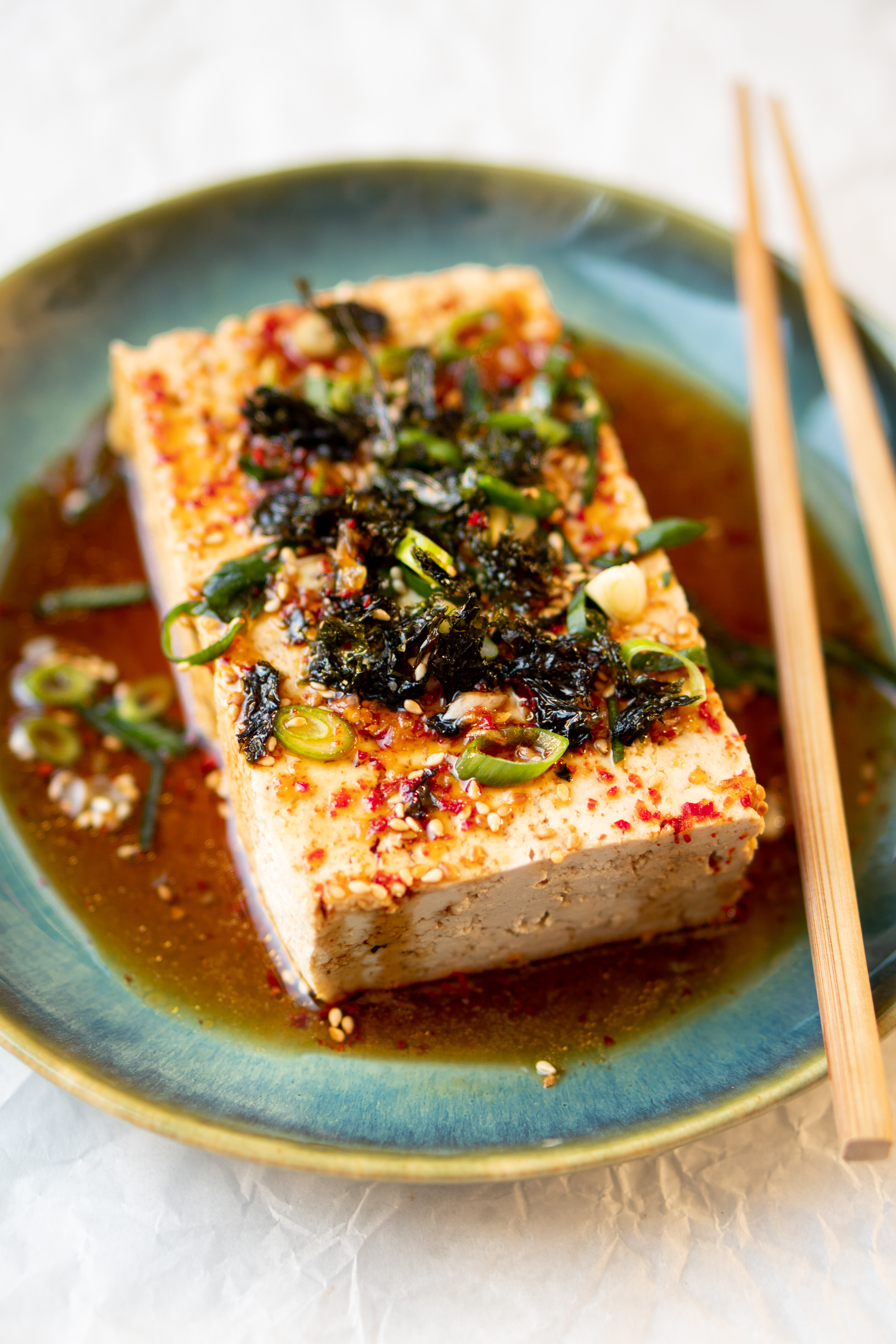 - Haal de tofu uit het warme water, leg op een bord en lepel de sojadressing eroverheen. Bestrooi met de sesamzaadjes, de bosui en de nori.