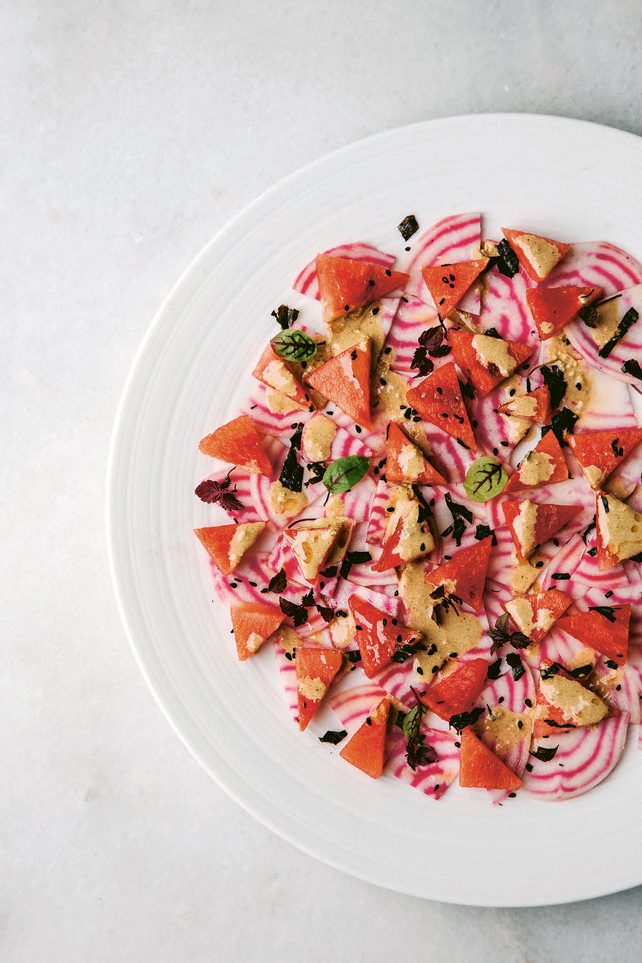Nina: “Deze felgekleurde salade om te delen combineert zoete watermeloen met aardse chioggiabietjes, en is vanwege de friszoete en hartige smaken een uitstekende appetizer. Maar de saus is de echte ster in het geheel. Je kunt deze romige misosaus warm of koud serveren, en bij allerlei soorten gegaarde of rauwe groenten. Ik noem hem miso-wauw-saus!