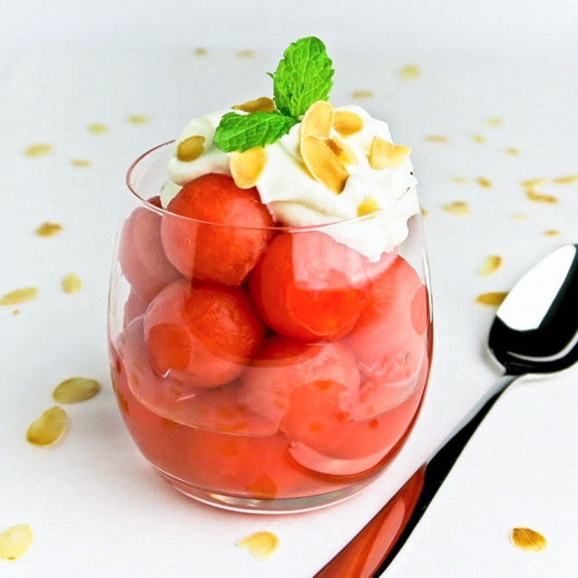 Verdeel de meloenbolletjes over 6 glazen of schaaltjes. Schenk over elk dessert wat van de marinade. Schep er een paar lepels slagroom overheen. Garneer de watermeloensalade et de geroosterde amandelen en de munt.