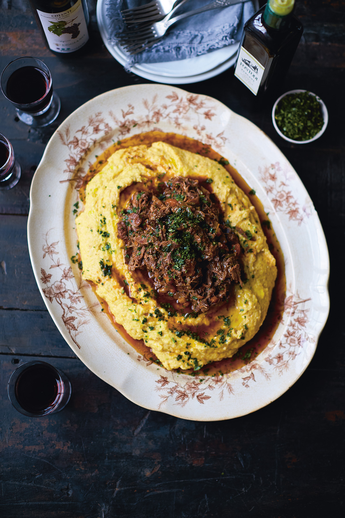 Jamie: “Dit is een ode aan de kookkunsten van Nonna Miriam. Door het vlees langzaam te laten garen, krijgt het een diepe smaak en wordt het zalig mals. Voel je vrij om je basis aan te vullen met andere knollen uit het seizoen.”