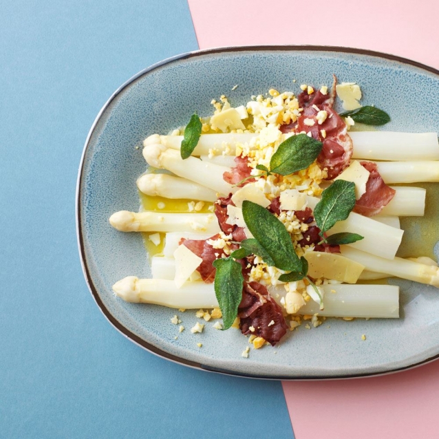 Witte asperges met gebakken ham, ei, salie en kaas van ZTRDG