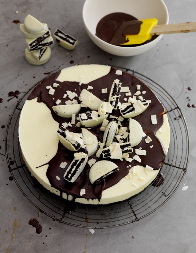 Roer de olie door de gesmolten pure chocolade. Dip de Oreo’s White Choc in de chocolade en druk ze in de taart. Versier die met overgebleven pure chocolade en de witte chocoladevlokken. De taart hoeft niet gebakken te worden, maar moet wel een paar uur opstijven in de koelkast.