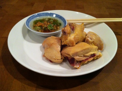Nu moet de kip in stukken worden gehakt. Chinezen trekken zich daarbij weinig aan van de anatomie van het beest. Ze hakken niet noodzakelijkerwijs door de gewrichten, maar dwars door alle botjes heen. Neem een flink mes en hak de kip eerst doormidden. Snijd de vleugeltjes eraf en hak deze doormidden. Snijd de dijen los en hak de pootjes eraf. Hak de dijen elk in een paar stukken en de pootjes doormidden. Je hebt nu twee romphelften over. Hak ook deze in flinke, maar hapklare brokken. Het vel eet je straks niet op, maar hoort wel keurig over het vlees te blijven liggen. Leg alle stukjes kip netjes gerangschikt naast elkaar op een schaal.