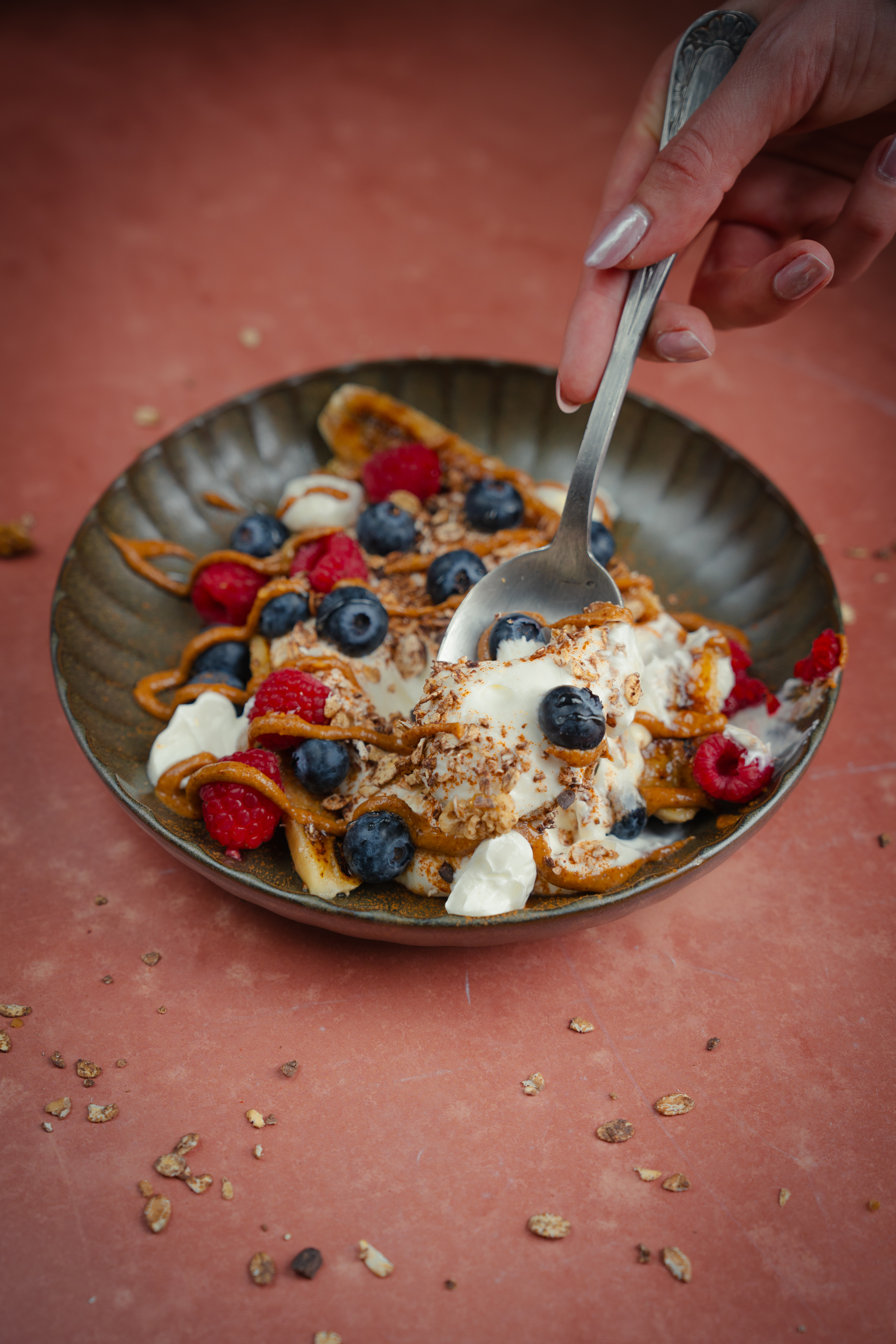 - Verdeel de granola, de bosbessen en de frambozen over het geheel.