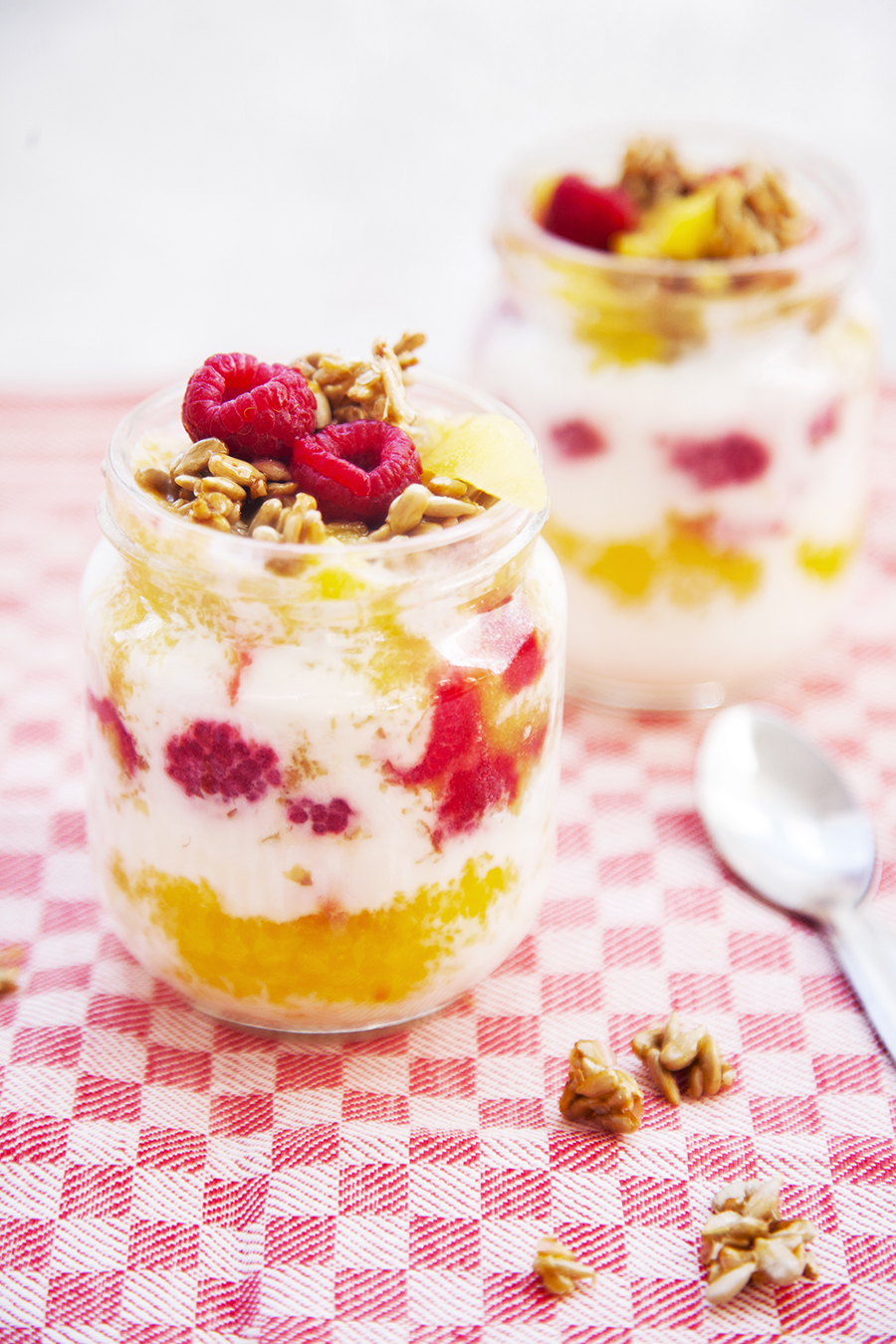 Verdeel de yoghurt over de potjes. Schep daar vervolgens het mangomengsel en de frambozen bovenop. Roer dit door de yoghurt. Brokkel de inmiddels hard geworden gekaramelliseerde zaden in stukjes en maak het potje ermee vol. Deksel erop en meenemen maar!