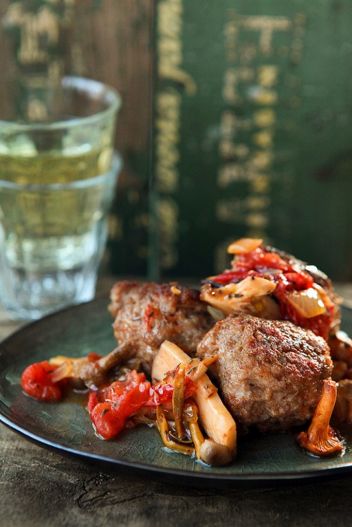 Haal de balletjes uit de pan en fruit nu de ui en knoflook in de pan. Maak ondertussen de paddestoelen schoon, snijd in gelijke stukken en bak 5 minuutjes op hoog vuur met de ui. Doe er de tomaten en witte wijn bij, kruid met peper, zout en tijm en laat 7-8 minuutjes sudderen.