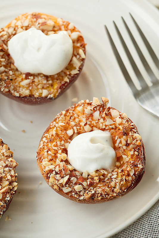 Haal de perziken uit de oven en leg op een bord met daarop wat van de yoghurt. Zalig.
