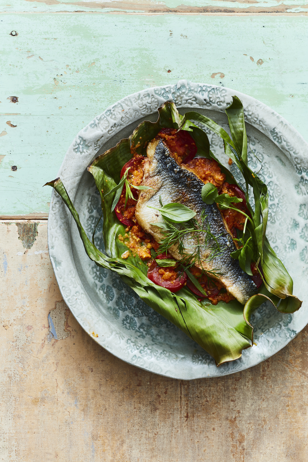 Zeebaars pepesan tomat: da’s knapperige zeebaars met bumbu pepesan in geurig bananenblad. Lijkt een berg werk, kost je slechts 30 minuten bereidingstijd. De keuken rocken noemen we dat, of beter nog: indorocken. Dit recept komt namelijk uit het fantastische boek INDOROCK van Vanja van der Leeden.