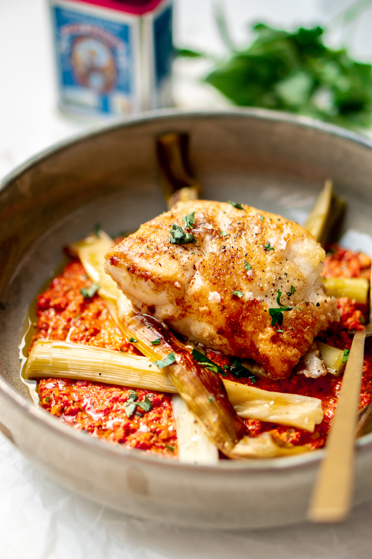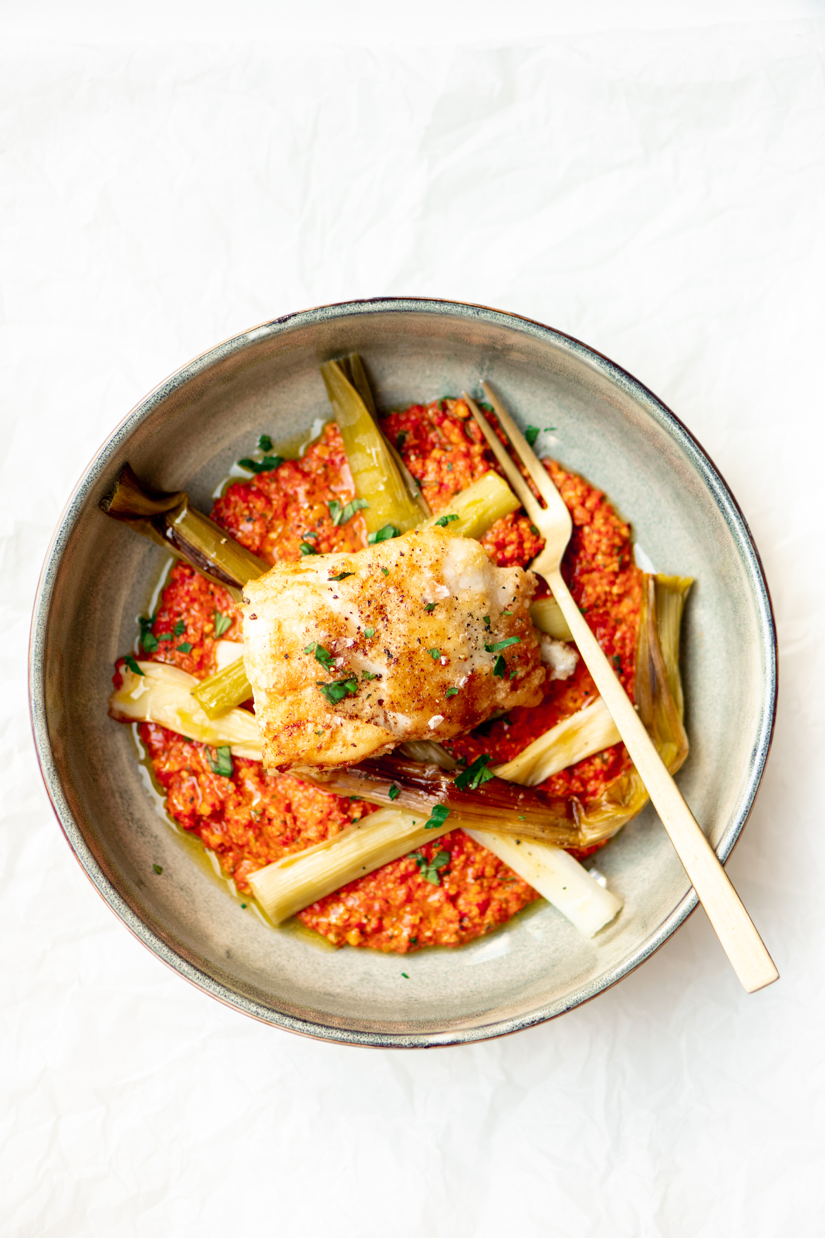 Zeeduivel met romescosaus en geblakerde prei uit de oven