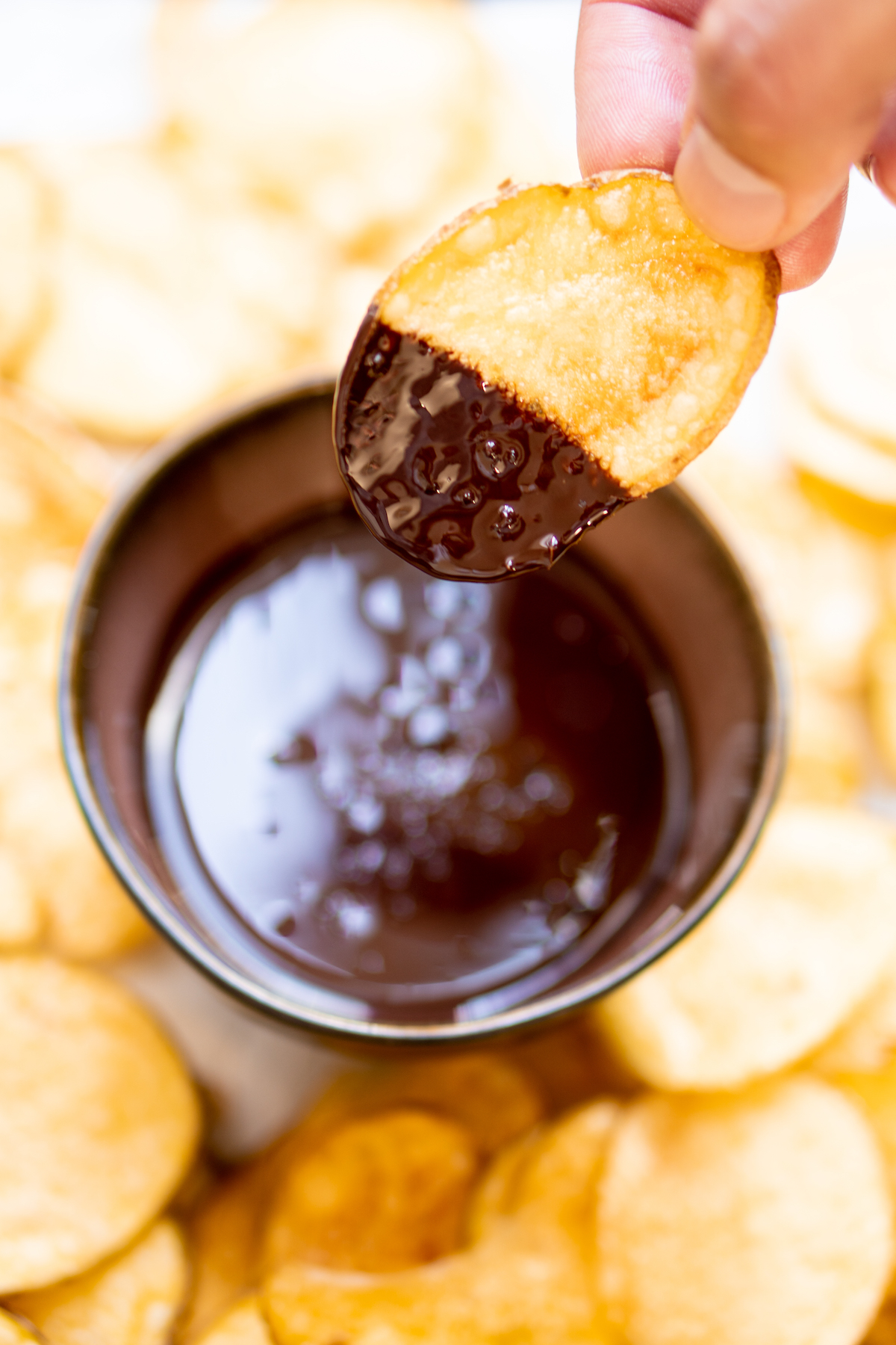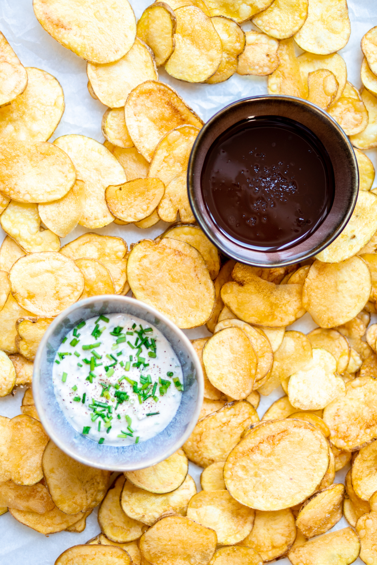 De dips die we erbij maken, maken we in een hartige en een zoete variant. Voor de hartige gingen we voor de klassieker sour cream & onion. De zoete is een verwijzing naar een variant die we ooit aten bij Super Lyan in Amsterdam: pure chocolade met een snufje zeezout. Voor alle zoet-zout-lovers.