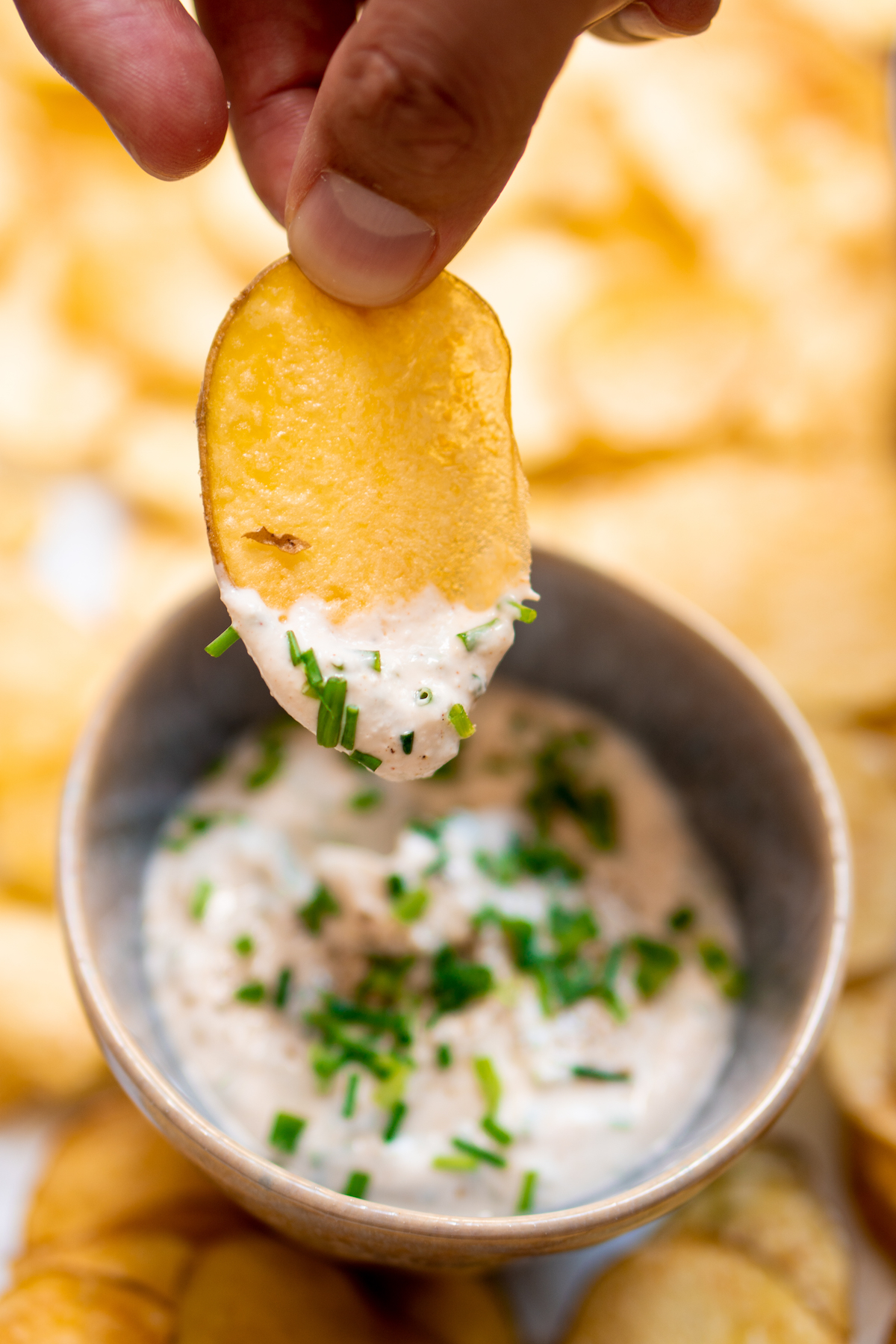 Meng voor de sour cream & onion dip alle ingrediënten in een kommetje. Garneer met wat van de fijngehakte bieslook.
