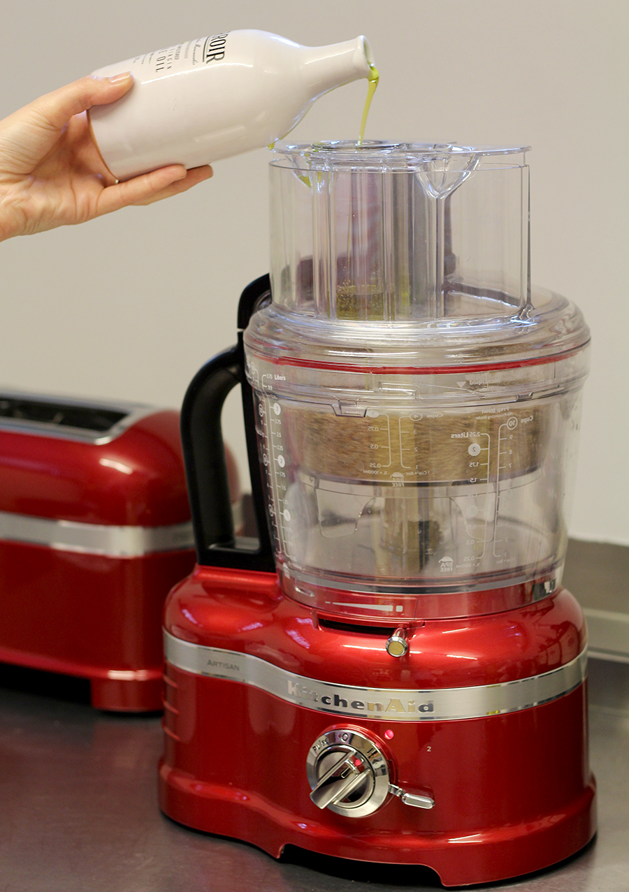 Doe de sesam in een kleine keukenmachine of blender samen met een scheutje olijfolie en pureer. Haal regelmatig met een pannenlikker de randjes naar beneden en voeg extra olie toe tot je de gewenste consistentie hebt bereikt.