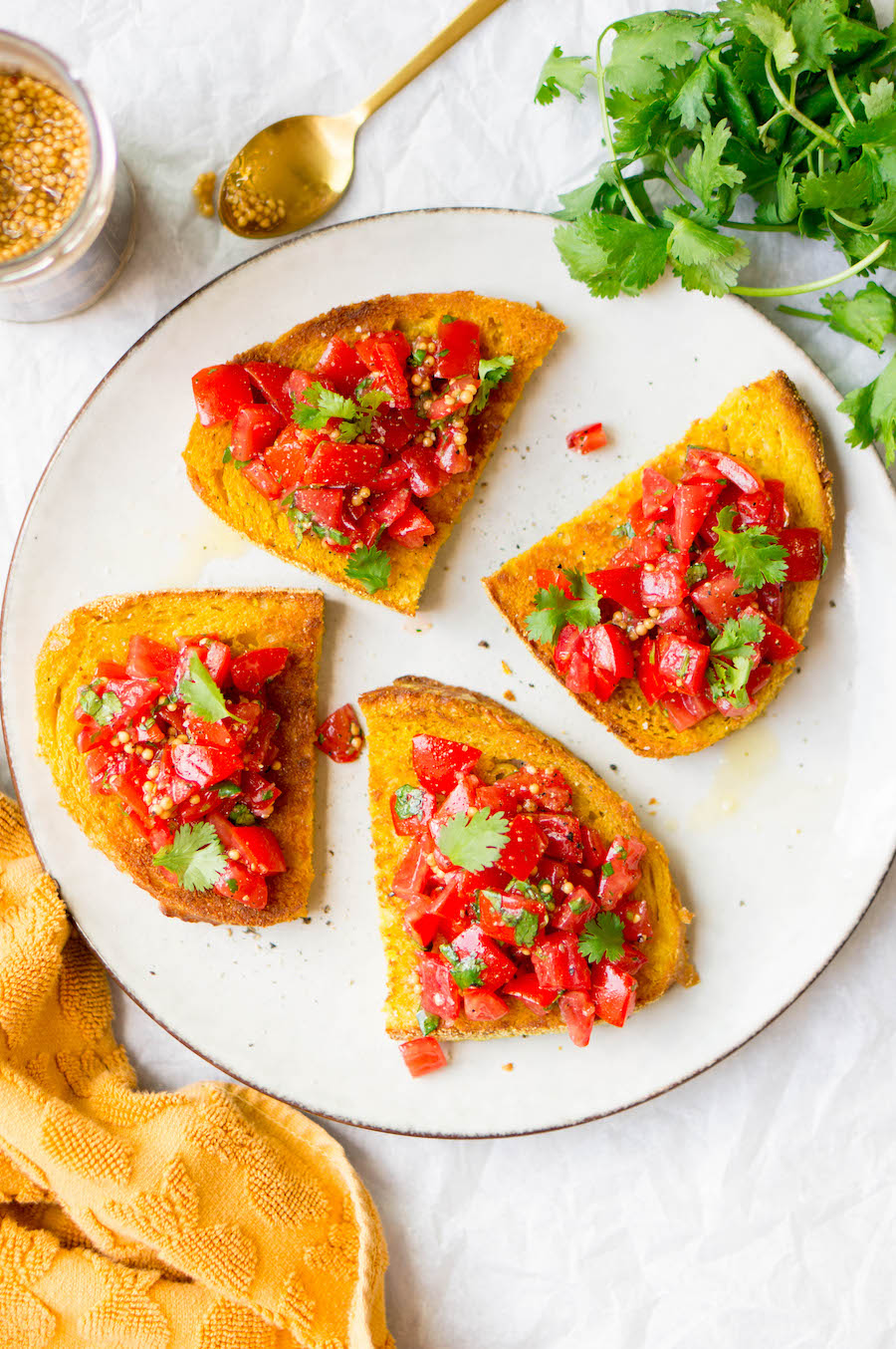 Een heerlijke (simpele) lunch of borrelhap: toast met kurkuma-boter en tomatensalade