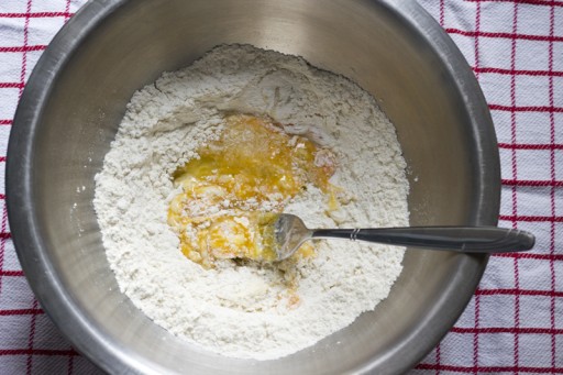 - Klop het ei en de bloem los met een vork.