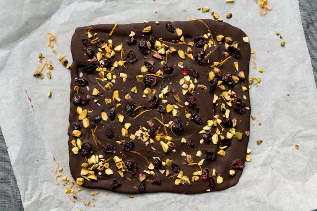 Het enige wat je ervoor hoeft te doen, is chocolade te smelten en te versieren met alles wat je lekker vindt. Je hoeft dus niet eens chocolade te temperen, wat soms best een ingewikkeld klusje is. Nadat je chocoladeplak is versierd, gaat -ie een uurtje in de koelkast. Daarna hak je ‘m in grove stukken.