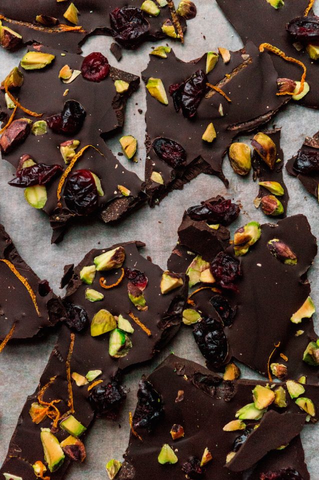 Breek de chocolade in gelijke stukjes en smelt die au bain marie. Giet de chocolade daarna uit over een stuk bakpapier op een bakplaat of in en bakblik (houd er rekening mee dat die in de koelkast past!). Strooi er de pistachenoten, cranberry’s en sinaasappelrasp overheen en zet een uurtje in de koelkast.