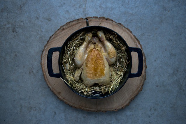 Leg de kip in het hooi en bedek deze met nog wat hooi. Doe de deksel op de pan; hHet is belangrijk dat de pan goed gesloten is voordat deze in de oven gaat. Zet de pan nu 1,5 uur uur in de voorverwarmde oven op 180 graden.